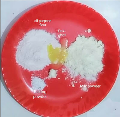 - Take a bowl, Add 1cup of milk pwd,1 tsp desi ghee, 4 tbsp all-purpose flour.